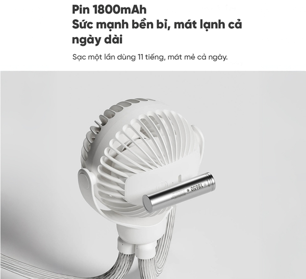 Dù nhỏ gọn, quạt vẫn sở hữu viên pin 1800mAh cho thời gian sử dụng lên đến 11 giờ liên tục chỉ với một lần sạc. Đây là lựa chọn hoàn hảo cho những buổi dạo chơi ngoài trời hay khi mất điện, giúp bé yêu luôn được mát mẻ suốt cả ngày dài.