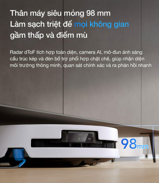 Thiết kế siêu mỏng 98mm giúp robot dễ dàng di chuyển dưới gầm giường, sofa hoặc tủ thấp. Hệ thống radar tích hợp giúp nhận diện tốt không gian tối và duy trì hướng di chuyển ổn định.