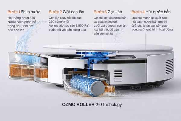 Công nghệ OZMO ROLLER 2.0 sử dụng con lăn xoay tốc độ 220 vòng/phút kết hợp áp lực 3.800 Pa giúp làm sạch vết bẩn hiệu quả. Hệ thống phun nước 8 lỗ giữ con lăn luôn ẩm và sạch trong suốt quá trình lau.