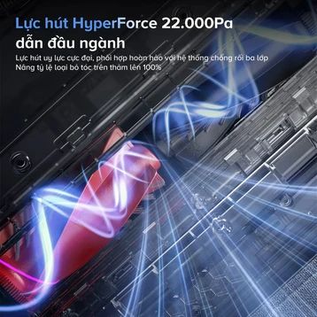 Lực hút mạnh 22.000Pa: Công nghệ HyperForce™ giúp hút sạch bụi, lông tóc, mảnh vụn trên cả sàn cứng lẫn thảm dày.