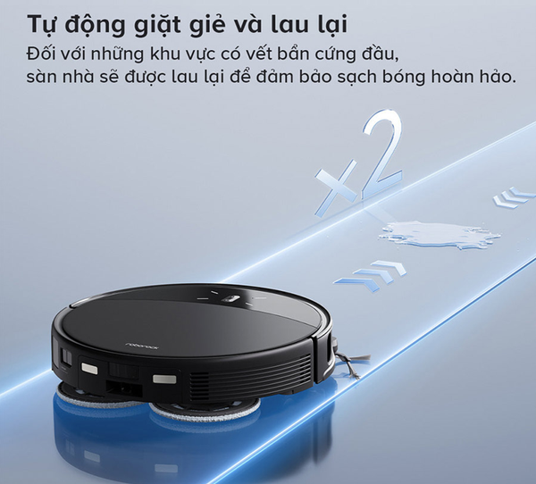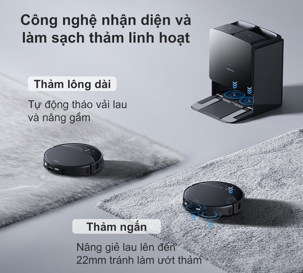 Đặc biệt, khi gặp thảm, robot sẽ tự động nâng hoặc tháo giẻ lau, tránh làm ướt thảm – một cải tiến thông minh giúp bảo vệ vật liệu sàn và tối ưu hiệu suất vệ sinh.