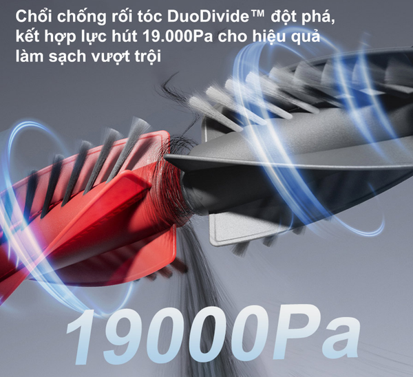 Công nghệ DuoDivide™ Brush sử dụng chổi xoắn kép thiết kế đặc biệt giúp ngăn tóc và lông thú cuốn vào lõi chổi.