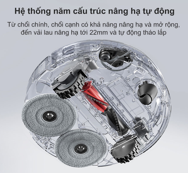 Roborock Saros 10R được trang bị 5 cơ cấu nâng hạ độc lập gồm chổi chính, chổi cạnh, bánh xe và giẻ lau. Mỗi bộ phận đều có thể tự điều chỉnh độ cao, đảm bảo robot thích ứng hoàn hảo với các bề mặt khác nhau.