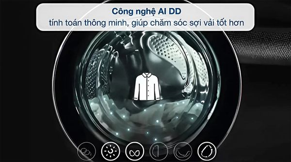 - Công nghệ AI DD nhận diện chất liệu và độ nặng của quần áo, từ đó tự động điều chỉnh chu trình giặt phù hợp nhằm giảm hao mòn và tăng độ bền cho sợi vải.