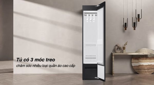 - Tủ chăm sóc quần áo được thiết kế nhỏ gọn với 3 móc treo, phù hợp đặt tại phòng ngủ, phòng thay đồ hoặc căn hộ chung cư hiện đại. Mặt gương kết hợp bảng điều khiển cảm ứng tùy chọn tiếng Việt hoặc tiếng Anh, tạo nên trải nghiệm thân thiện và đẳng cấp.