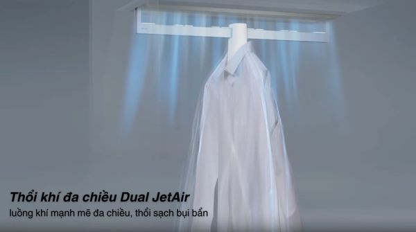 - Dual JetAir thổi khí từ hai chiều, loại bỏ bụi bẩn và tóc rơi trên sợi vải mà không làm nhàu áo quần.