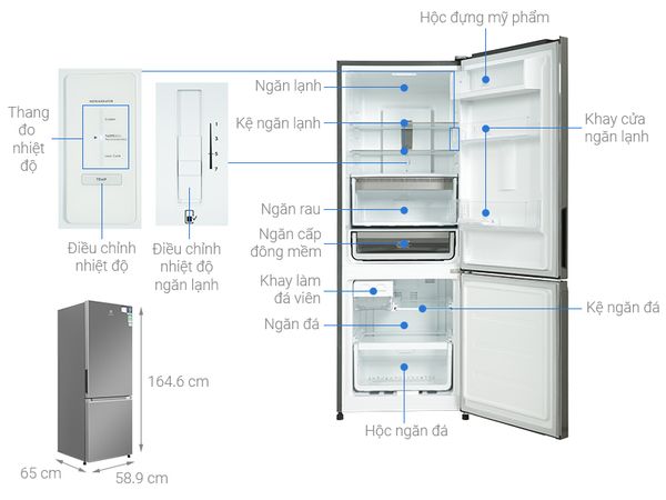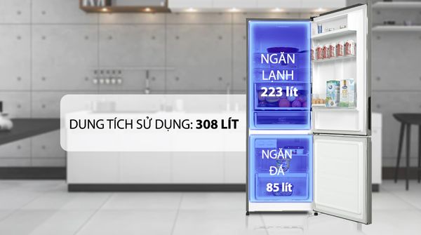 - Dung tích sử dụng 308 lít, trong đó ngăn mát 223 lít và ngăn đá 85 lít, phù hợp nhu cầu sử dụng của gia đình từ 3 – 4 thành viên hoặc gia đình đông thành viên hơn nhưng nhu cầu bảo quản ít thực phẩm.