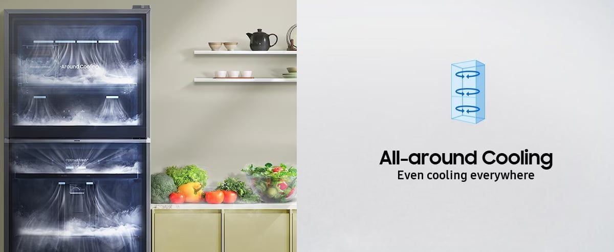 Công nghệ "All-around Cooling" giúp ngăn chặn tình trạng thực phẩm bị hỏng nhanh, đặc biệt là tại những vị trí xa ngăn đông mềm. Điều này đảm bảo rằng bạn có thể bảo quản thực phẩm một cách tốt nhất và giữ chúng tươi ngon trong thời gian dài.