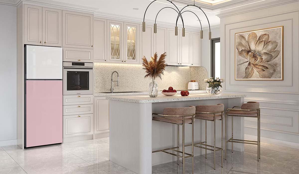 Tủ Lạnh Samsung Inverter 348 Lít Bespoke RT35CB56448CSV với màu sắc đặc biệt là trắng kết hợp với hồng, tạo điểm nhấn thú vị cho không gian bếp của bạn. Sự kết hợp màu sắc tinh tế giúp tủ lạnh trở nên nổi bật và hài hòa với trang trí nội thất.