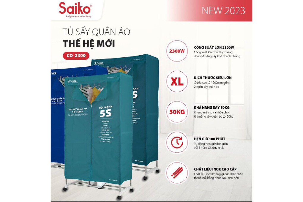 Tủ sấy quần áo Saiko CD-2300 (2300W - 50KG), “Cứu tinh quần áo”
