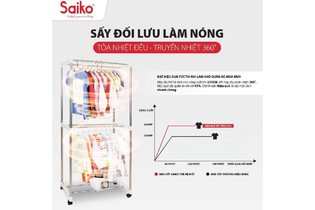 Bạn không phải mất thời gian ngồi đợi cho đến khi quần áo khô. Saiko CD-2300 có chức năng hẹn giờ tắt lên đến 180 phút giúp bạn tiết kiệm thời gian làm việc khác hoặc sấy khô quần áo trước khi đi ngủ, bạn yên tâm, sáng mai thức dậy bạn đã có quần áo khô để mặc rồi